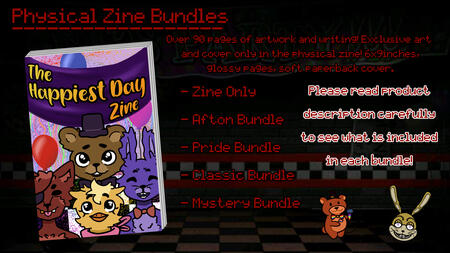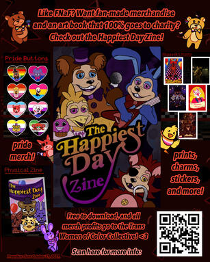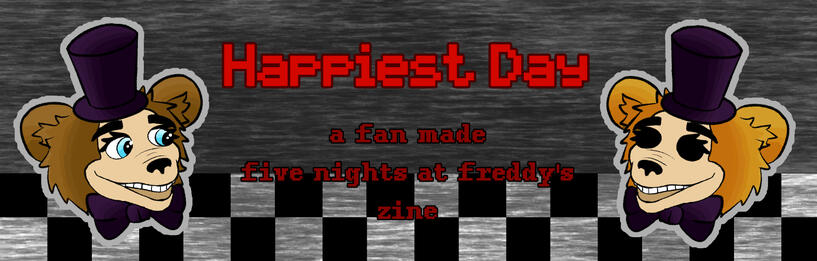 Slimefiish Productions.From our Carrd “Happiest Day is a fan-made zine paying tribute to the first story arc of Five Nights at Freddy's. The zine will cover content from FNAF1 to UCN.The purpose of the zine is to celebrate the past (nearly!) 7 years of the franchise in preparation for the release of FNAF: Security Breach!The focus of the zine is to summarize the story of FNAF in creative art pieces, cosplay, writing, and whatever else contributors want to create. Pieces will be arranged in chronological order, starting from FNAF1, and ending with UCN.”This was our first time running a zine. You can visit our Tumblr here to see all of the art previews and other posts we made. We created art to promote the application form, and got way more applicants than we had ever hoped! We gave the applicants until August 10th to finish their pieces, and we released the zine on August 18th, 2021.